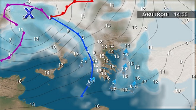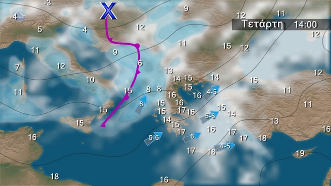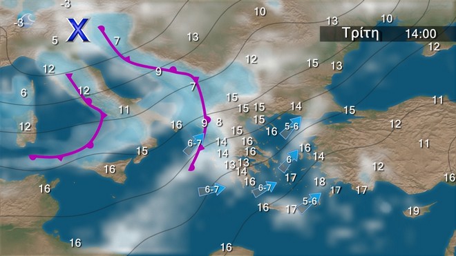 Στη Θράκη, τα νησιά του ανατολικού Αιγαίου και τα Δωδεκάνησα αυξημένες νεφώσεις με βροχές και καταιγίδες που από το μεσημέρι βαθμιαία θα εξασθενήσουν. Στα δυτικά, τις Κυκλάδες και την Κρήτη νεφώσεις κατά τόπους αυξημένες με τοπικές βροχές και τις πρωινές ώρες μεμονωμένες καταιγίδες. Στις υπόλοιπες περιοχές λίγες νεφώσεις. Λίγα χιόνια θα πέσουν στα ηπειρωτικά ορεινά τις πρωινές ώρες. Οι άνεμοι θα πνέουν από νότιες διευθύνσεις 4 με 6 και τις πρωινές ώρες στο Αιγαίο και από το βράδυ στο Ιόνιο, τοπικά 7 μποφόρ. Η θερμοκρασία δεν θα σημειώσει αξιόλογη μεταβολή.