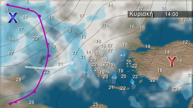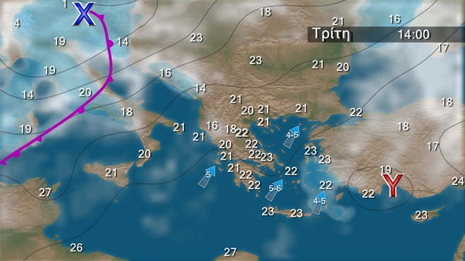 Στη Θράκη, την ανατολική και νότια νησιωτική χώρα βροχές και σποραδικές καταιγίδες, πιθανώς κατά τόπους ισχυρές στα νησιά του ανατολικού Αιγαίου και τα Δωδεκάνησα τις πρωινές ώρες και σταδιακή βελτίωση από το απόγευμα. Στις υπόλοιπες περιοχές λίγες νεφώσεις, παροδικά αυξημένες στα δυτικά τις πρωινές ώρες οπότε και θα σημειωθούν τοπικές βροχές. Οι άνεμοι θα πνέουν, νότιοι νοτιοδυτικοί 3 με 5 και τις πρωινές ώρες στο Αιγαίο τοπικά 6 μποφόρ. Η θερμοκρασία θα σημειώσει μικρή άνοδο ως προς τις μέγιστες τιμές.