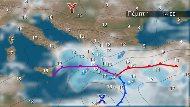 Την Πέμπτη προβλέπονται νεφώσεις με τοπικές βροχές κυρίως στα δυτικά, τα κεντρικά και τα νότια. Σποραδικές καταιγίδες, πιθανώς κατά τόπους ισχυρές, θα εκδηλωθούν κυρίως στις κεντρικές και νότιες θαλάσσιες παραθαλάσσιες περιοχές. Χιονοπτώσεις στα ορεινά και βαθμιαία σε ημιορεινές περιοχές της κεντρικής και βόρειας ηπειρωτικής χώρας. Βαθμιαία από το απόγευμα τα φαινόμενα θα εξασθενήσουν και τη νύχτα θα περιοριστούν στη νότια νησιωτική χώρα. Οι άνεμοι θα πνέουν ανατολικοί βορειοανατολικοί 5 με 7, στα ανατολικά και βαθμιαία στα νότια 8 και πιθανώς τοπικά 9 μποφόρ. Η θερμοκρασία θα παρουσιάσει περαιτέρω πτώση, θα κυμανθεί σε χαμηλά για την εποχή επίπεδα.