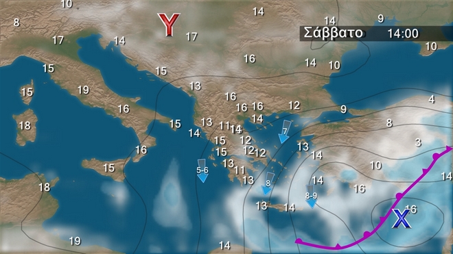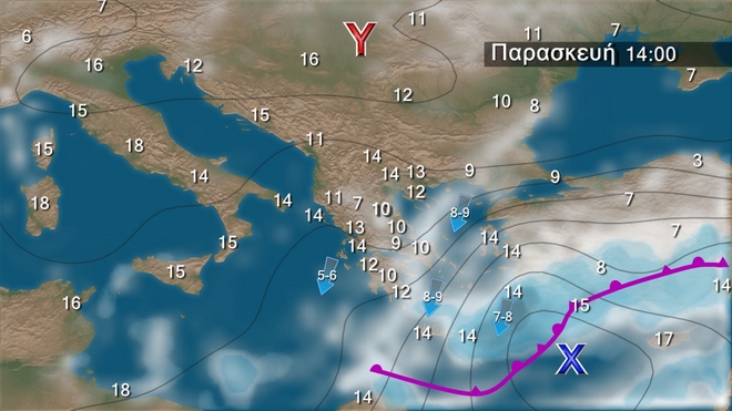 Την Παρασκευή και το Σάββατο στα δυτικά προβλέπονται λίγες νεφώσεις παροδικά αυξημένες. Στις υπόλοιπες περιοχές νεφώσεις παροδικά αυξημένες με τοπικές βροχές κυρίως στα νότια, ενώ σποραδικές καταιγίδες θα εκδηλωθούν στα Δωδεκάνησα την Παρασκευή μέχρι το μεσημέρι. Παροδικές χιονοπτώσεις θα σημειωθούν στα ορεινά της Κρήτης και πρόσκαιρα την Παρασκευή ασθενείς στα ηπειρωτικά ορεινά. Οι άνεμοι θα πνέουν από βόρειες διευθύνσεις, στα δυτικά 4 με 6 πρόσκαιρα τοπικά 7 μποφόρ και στα ανατολικά 6 με 8 και στο Αιγαίο τοπικά 9 μποφόρ. Η θερμοκρασία θα κυμανθεί σε χαμηλά για την εποχή επίπεδα, με μικρή άνοδο από την Κυριακή και μετά.