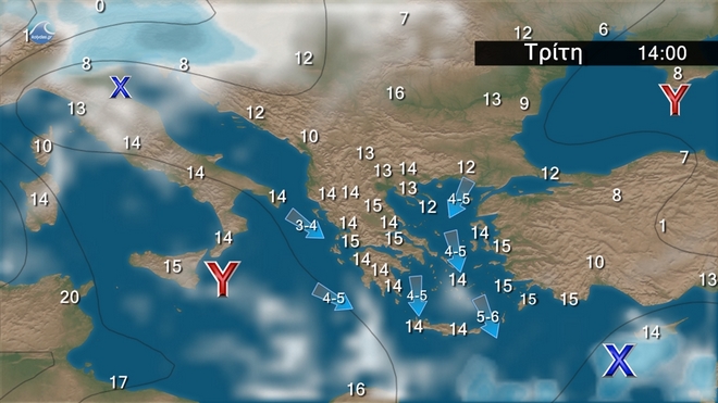 Στα δυτικά και τα βόρεια αίθριος καιρός. Στις υπόλοιπες περιοχές νεφώσεις παροδικά αυξημένες με τοπικές βροχές στις Κυκλάδες, την Κρήτη και τις πρωινές ώρες στα ανατολικά ηπειρωτικά και τα Δωδεκάνησα. Οι άνεμοι θα πνέουν βόρειοι βορειοανατολικοί στα δυτικά 3 με 5 μποφόρ, στα ανατολικά 4 με 6 και στο Αιγαίο 7 με 8 μποφόρ, με μικρή εξασθένηση από το απόγευμα. Η θερμοκρασία δεν θα σημειώσει αξιόλογη μεταβολή.