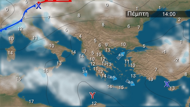 Την Πέμπτη στα βορειοδυτικά προβλέπονται λίγες νεφώσεις που βαθμιαία θα αυξηθούν και από το απόγευμα θα σημειωθούν τοπικές βροχές. Στην υπόλοιπη χώρα θα υπάρχουν λίγες πρόσκαιρες νεφώσεις. Οι άνεμοι θα πνέουν δυτικοί νοτιοδυτικοί 3 με 5 και στα νότια τοπικά 6 μποφόρ. Η θερμοκρασία θα παρουσιάσει άνοδο.