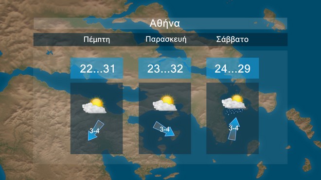Στην Αττική προβλέπονται λίγες νεφώσεις παροδικά αυξημένες στα βόρεια. Η θερμοκρασία θα κυμανθεί από 19 έως 31 βαθμούς Κελσίου.