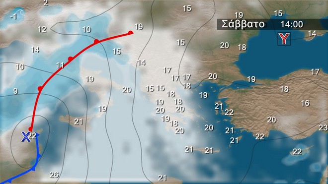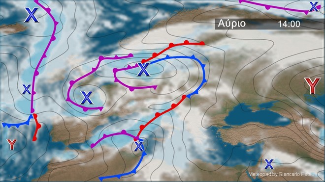 Στον χάρτη της Βαλκανικής διακρίνεται το ομαλό πεδίο πάνω από τη χώρα μας, καθώς και το χαμηλό που αρχίζει να δημιουργείται στις ακτές της Τυνησίας.
