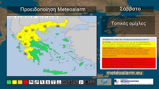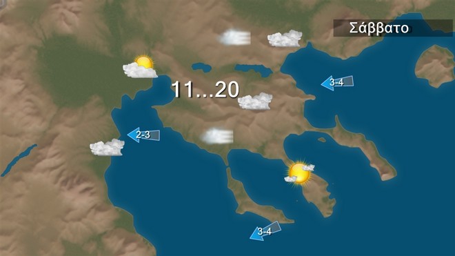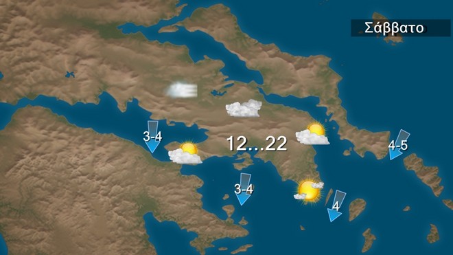 Το Σάββατο θα έχουμε αυξημένη συννεφιά κυρίως στα δυτικά και τα υπόλοιπα ηπειρωτικά. Περιορισμένη ορατότητα ή κατά τόπους ομίχλη προβλέπεται τις πρωινές ώρες στα ηπειρωτικά. Στα δυτικά θα επικρατήσουν νότιοι άνεμοι, στο Ιόνιο 6 και από το βράδυ τοπικά 7 μποφόρ και στα ανατολικά βορείων διευθύνσεων μέχρι 5 μποφόρ. Η θερμοκρασία δεν θα σημειώσει αξιόλογη μεταβολή και θα φτάσει τους 21 βαθμούς στα βόρεια, στα υπόλοιπα ηπειρωτικά και το Ιόνιο τους 22 με 23 και στα νησιά του Αιγαίου τους 23 με 24 βαθμούς Κελσίου.