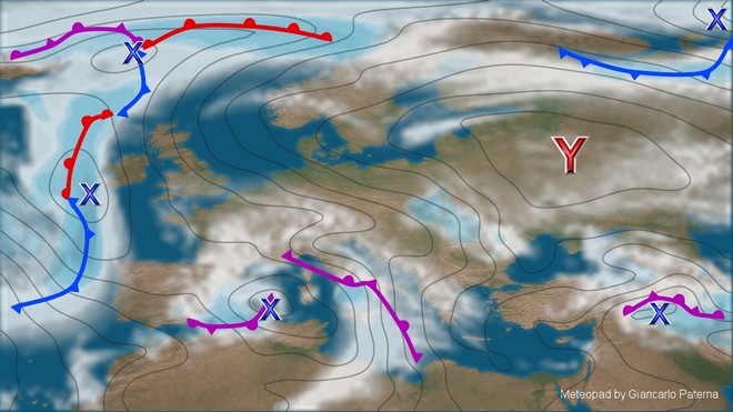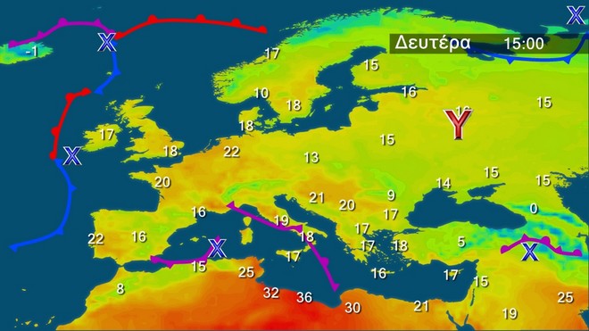 Στον γενικό χάρτη της Ευρώπης παρατηρούμε ότι διατηρείται ο αντικυκλώνας στα βόρεια και ενώ πλησιάζει χαμηλό από την δυτική Μεσόγειο το οποίο θα προκαλέσει μεγάλη μεταφορά σκόνης στη περιοχή μας.