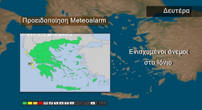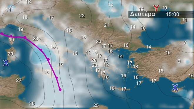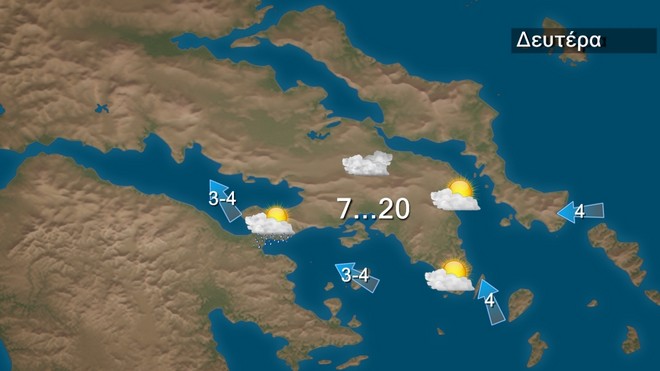 Στον χάρτη της Βαλκανικής που ακολουθεί παρατηρούμε ότι θα επηρεαστούν μερικώς οι δυτικές περιοχές και έτσι τη Δευτέρα τα φαινόμενα θα είναι σποραδικά κυρίως από το απόγευμα στα δυτικά ηπειρωτικά και το Ιόνιο. Οι άνεμοι θα πνέουν στο Ιόνιο ΝΑ 5 με 6 και αργότερα τοπικά 7 μπ και στο Αιγαίο ανατολικοί 4 με 5 μπ. Η θερμοκρασία θα φτάσει τους 20 βαθμούς στα βόρεια, στα υπόλοιπα ηπειρωτικά τους 21 και στα νησιά του Αιγαίου τους 18 βαθμούς Κελσίου.