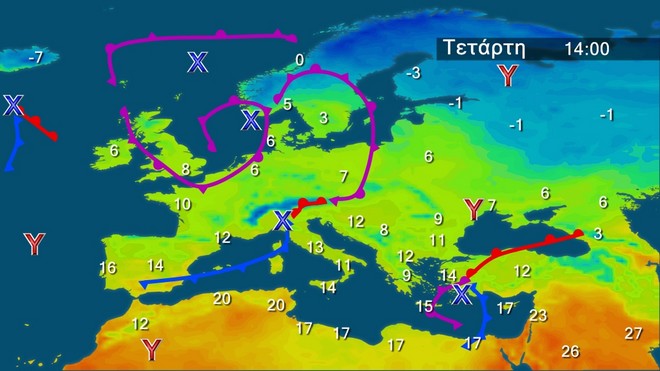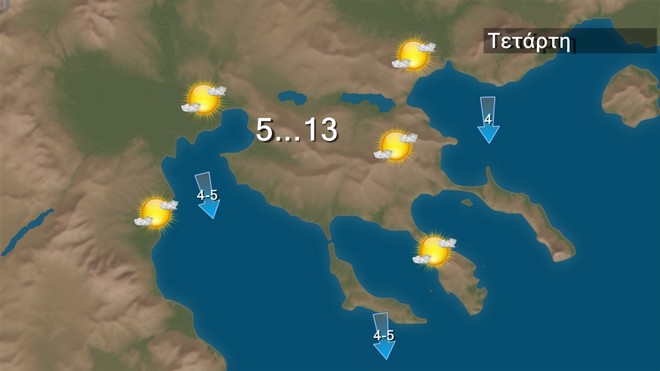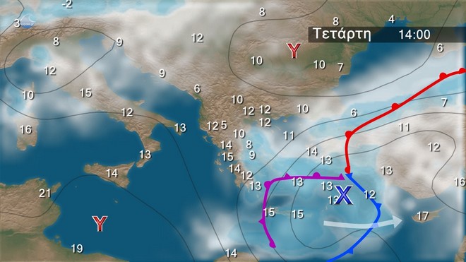 Στον χάρτη της Βαλκανικής που ακολουθεί αλλά και στον γενικό χάρτη Ελλάδος παρατηρούμε ότι το βαρομετρικό χαμηλό που μας επηρεάζει κινείται ανατολικά και έτσι από το πρωί ο καιρός θα βελτιωθεί στα δυτικά και βόρεια και αργότερα και στις υπόλοιπες περιοχές. Οι άνεμοι θα φτάσουν τα 6 με 7 και στα πελάγη τοπικά τα 8 με 9 μπ με βαθμιαία εξασθένηση από τις απογευματινές ώρες. Η θερμοκρασία θα φτάσει στα βόρεια το μεσημέρι τους 13 βαθμούς στα δυτικά τους 15 στα υπόλοιπα ηπειρωτικά τους 14 βαθμούς και στα νησιά του Αιγαίου τους 14 με 15 βαθμούς Κελσίου.