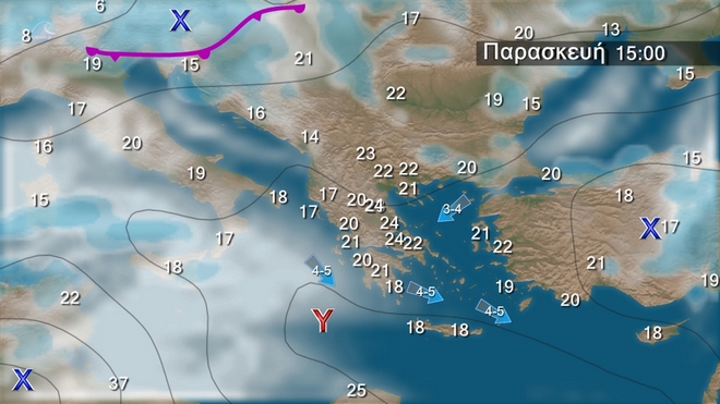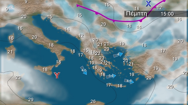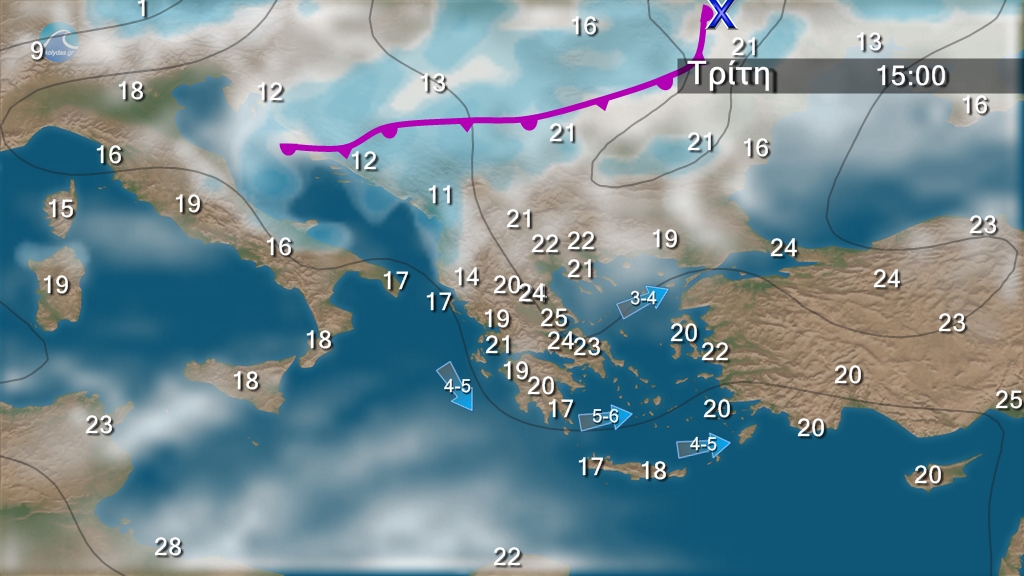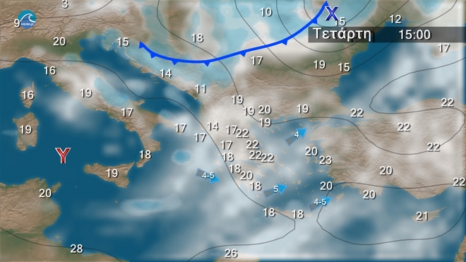 ώρες. Οι άνεμοι θα πνέουν στα δυτικά από δυτικές διευθύνσεις 3 με 4 και στα ανατολικά από νότιες 4 με 5 μποφόρ. Η θερμοκρασία δεν θα σημειώσει αξιόλογη μεταβολή.