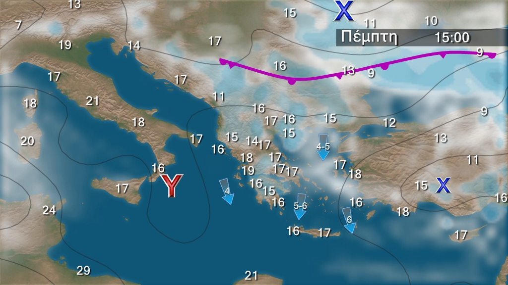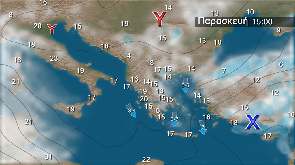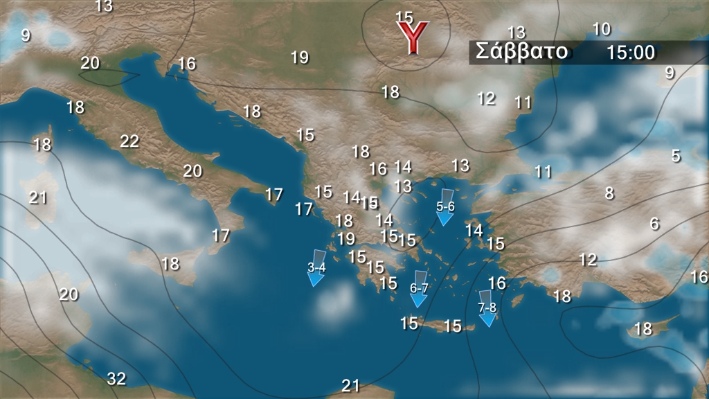 Η αστάθεια θα αρχίσει να περιορίζεται καθώς θα επικρατήσουν βόρειοι άνεμοι 5-6 και -7 μπ στα νότια.