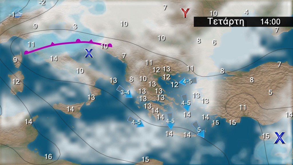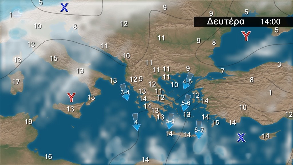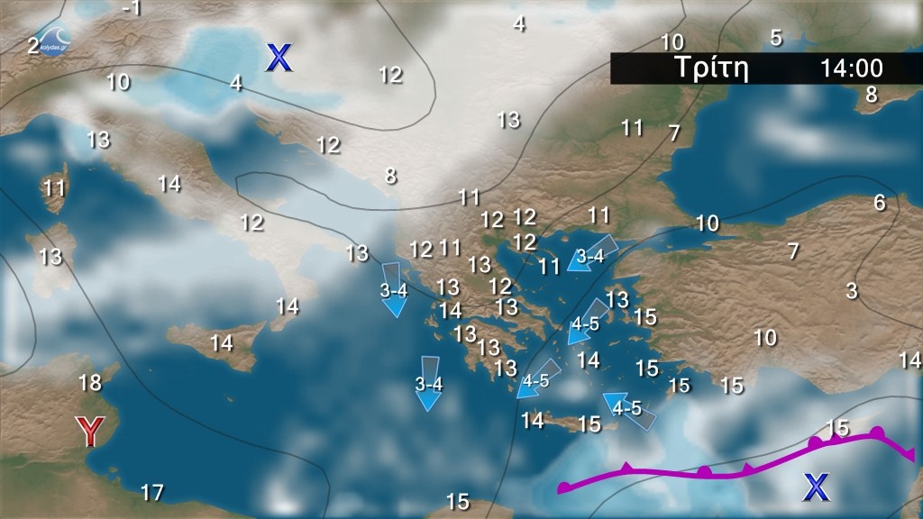 Στην κεντρική Μακεδονία, τη Θεσσαλία, τις Σποράδες, την ανατολική Στερεά, την Εύβοια, την ανατολική Πελοπόννησο, τις Κυκλάδες και την Κρήτη, νεφώσεις παροδικά αυξημένες με τοπικές βροχές, που από το μεσημέρι θα περιοριστούν στις Κυκλάδες και κυρίως στην Κρήτη. Πρόσκαιρες χιονοπτώσεις θα σημειωθούν στα ορεινά της Κρήτης. Στις υπόλοιπες περιοχές γενικά αίθριος καιρός, με πρόσκαιρες νεφώσεις στα νησιά του ανατολικού Αιγαίου και τα Δωδεκάνησα, όπου είναι πιθανό να σημειωθούν τοπικές βροχές τις πρωινές ώρες. Οι άνεμοι θα πνέουν βόρειοι βορειοανατολικοί στα δυτικά 3 με 5, στα ανατολικά 4 με 6 και στο Αιγαίο 7 με 8 μποφόρ, με εξασθένηση τη νύχτα. Η θερμοκρασία δεν θα σημειώσει αξιόλογη μεταβολή..