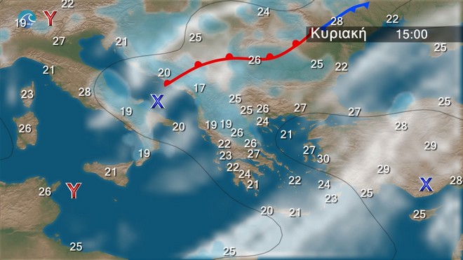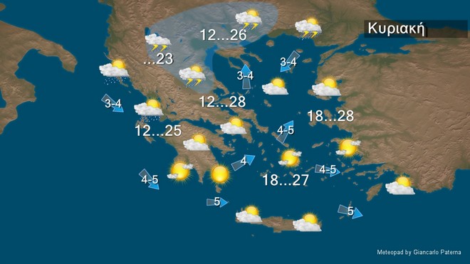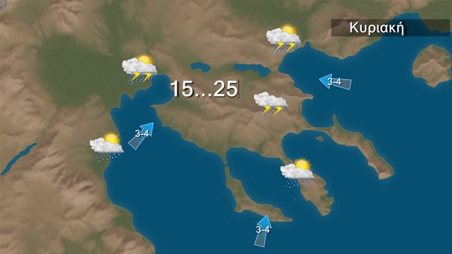 Στον χάρτη της Βαλκανικής διακρίνεται το αβαθές χαμηλό στην Αδριατική. Την Κυριακή στα δυτικά, τα κεντρικά και τα βόρεια προβλέπονται τοπικές βροχές και σποραδικές καταιγίδες κυρίως τις μεσημβρινές και απογευματινές ώρες στα ηπειρωτικά οι οποίες στη Μακεδονία και τη Θεσσαλία θα είναι κατά τόπους ισχυρές και πιθανώς να συνοδεύονται από χαλαζοπτώσεις. Η θερμοκρασία θα σημειώσει μικρή πτώση και θα φτάσει στα βόρεια τους 23 με 26 βαθμούς, στα υπόλοιπα ηπειρωτικά και το Ιόνιο τους 25 με 28 βαθμούς και στα νησιά του Αιγαίου τους 27 με 28 βαθμούς Κελσίου.