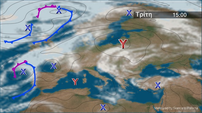 Στον γενικό χάρτη της Ευρώπης διακρίνονται τα βαρομετρικά χαμηλά που επηρεάζουν τη δυτική και βόρεια Ευρώπη. Στα κεντρικά υπάρχει εκτεταμένος αντικυκλώνας ενώ στην περιοχή μας διατηρούνται οι ψυχρές αέριες μάζες που βρίσκονται στις ανώτερες στάθμες της ατμόσφαιρας και οι οποίες θα προκαλέσουν άστατο καιρό.