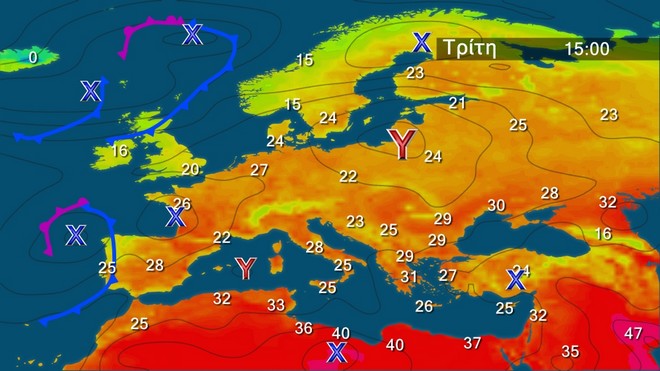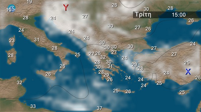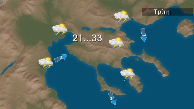 Την Τρίτη προβλέπονται λίγες νεφώσεις οι οποίες τις μεσημβρινές και απογευματινές ώρες στα ηπειρωτικά, την Κρήτη, τα νησιά του ανατολικού Αιγαίου και τα Δωδεκάνησα θα αυξηθούν και θα εκδηλωθούν τοπικοί όμβροι και κυρίως στα ηπειρωτικά σποραδικές καταιγίδες. Οι άνεμοι στα δυτικά θα είναι μεταβλητοί ασθενείς και το μεσημέρι-απόγευμα δυτικοί βορειοδυτικοί 3 με 4 μποφόρ. Στα ανατολικά θα είναι βόρειοι βορειοδυτικοί 3 με 4 και στο Αιγαίο τοπικά 5 μποφόρ. Η θερμοκρασία δεν θα σημειώσει αξιόλογη μεταβολή και θα φτάσει στα βόρεια τους 33 βαθμούς, στα υπόλοιπα ηπειρωτικά και το Ιόνιο τους 33 με 34 βαθμούς και στα νησιά του Αιγαίου τους 29 με 30 βαθμούς και τοπικά στη Κρήτη τους 31 βαθμούς Κελσίου.