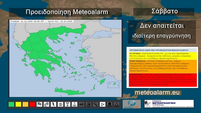 Το Σάββατο υπάρχει μικρή πιθανότητα για ασθενείς τοπικές βροχές τις πρωινές ώρες στην κεντρική Μακεδονία, στα ανατολικά ηπειρωτικά και τη βόρεια Κρήτη. Στις υπόλοιπες περιοχές γενικά αίθριος. Τοπικά περιορισμένη ορατότητα τις πρωινές και βραδινές ώρες στα δυτικά και βόρεια. Οι άνεμοι θα πνέουν από βόρειες διευθύνσεις 3 με 4, στο Αιγαίο 5 με 6 και από τις μεσημβρινές ώρες τοπικά 7 μποφόρ. Η θερμοκρασία θα φτάσει τους 26 βαθμούς στα βόρεια, στα υπόλοιπα ηπειρωτικά και το Ιόνιο τους 27 και στα νησιά τους 24 με 28 βαθμούς Κελσίου.