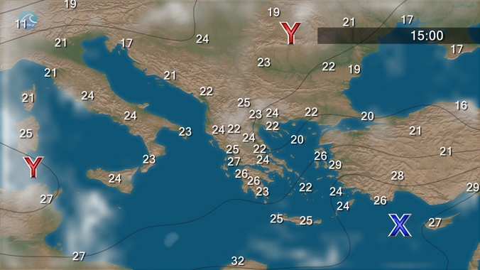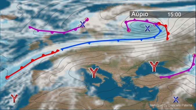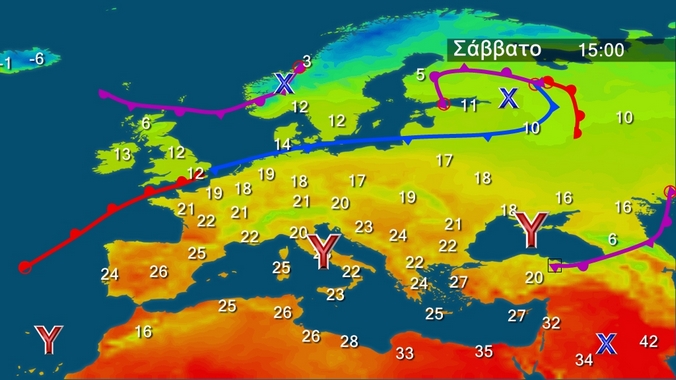 Στον γενικό χάρτη της Ευρώπης διακρίνονται ισχυρά βαρομετρικά χαμηλά στα δυτικά και ανατολικά τμήματα της Ευρώπης. Ένας εκτεταμένος αντικυκλώνας καλύπτει τα κεντρικά και νότια που επεκτείνεται ανατολικότερα και αυτό θα έχει σαν αποτέλεσμα από το Σαββατοκύριακο και μετά να επικρατήσει αίθριος καιρός στη χώρα.