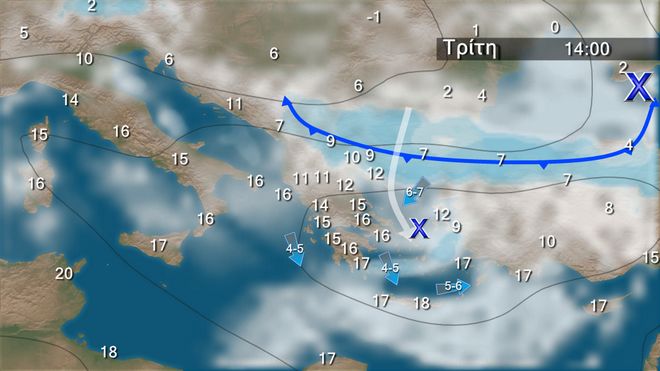 Ανήμερα των Χριστουγέννων υπάρχουν σαφείς ενδείξεις για τοπικές βροχές στα κεντρικά και βόρεια καθώς το ψυχρό μέτωπο που βρίσκεται στα βόρεια σύνορά μας την Τρίτη θα κινηθεί νοτιότερα. Το σύστημα αυτό την Τετάρτη θα προκαλέσει αισθητή πτώση της θερμοκρασίας σε όλη τη χώρα και θα έχουμε χιονοπτώσεις στα ορεινά καθώς και σε περιοχές με χαμηλότερο υψόμετρο από τα βόρεια.