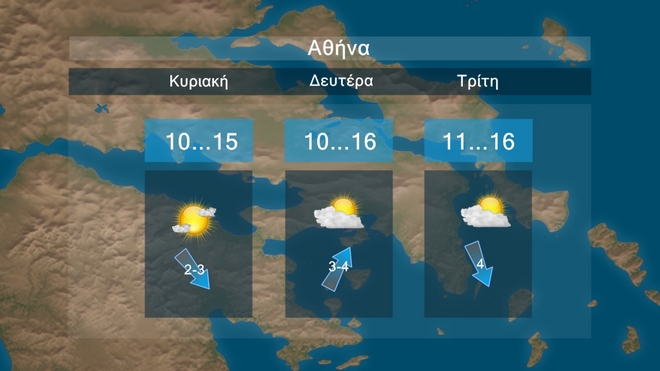 Από το Σάββατο έως και τη Δευτέρα θα επικρατήσει σχεδόν αίθριος καιρός με άνοδο της θερμοκρασίας. Οι άνεμοι δεν θα ξεπερνούν τα 4 με 5 και η θερμοκρασία θα ανέβει κυρίως στα νότια. Οι θερμοκρασίες θα βρίσκονται κατά 3 με 4 βαθμούς πάνω από τη μέση κλιματική τιμή.