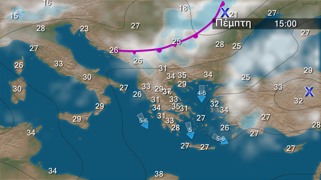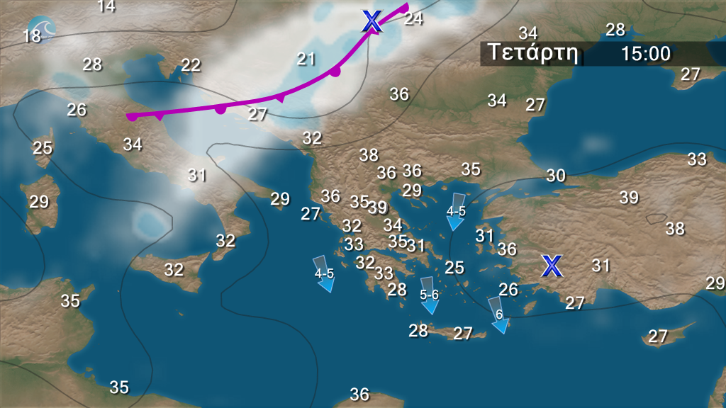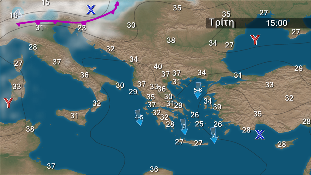 Διατηρείται η θερμοκρασία στα ηπειρωτικά τοπικά στους 38 με 40 βαθμούς Κελσίου - Μικρή κάμψη της θερμοκρασίας στα δυτικά - Η πρόγνωση του επόμενου τριημέρου από τον μετεωρολόγο Θοδωρή Κολυδά