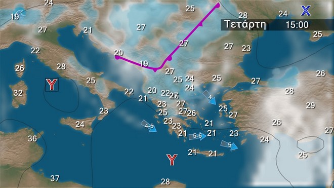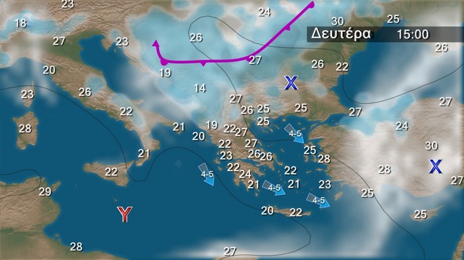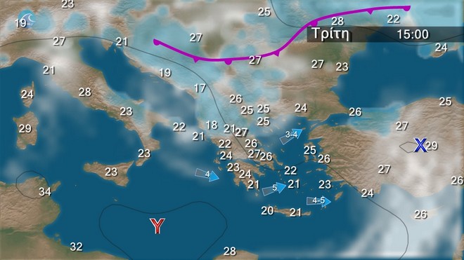 Στα δυτικά, τα κεντρικά και τα βόρεια παροδικά αυξημένες νεφώσεις με τοπικές βροχές και, κυρίως τις μεσημβρινές και απογευματινές ώρες, σποραδικές καταιγίδες. Στην υπόλοιπη χώρα, αραιές νεφώσεις που βαθμιαία στην Κρήτη και στα ηπειρωτικά θα πυκνώσουν και θα εκδηλωθούν τοπικοί όμβροι. Οι άνεμοι θα πνέουν δυτικοί νοτιοδυτικοί 3 με 5 και στα νότια πελάγη τοπικά 6 μποφόρ στρεφόμενοι στο κεντρικό και βόρειο Αιγαίο σε νότιους με την ίδια ένταση. Η θερμοκρασία σε μικρή πτώση.