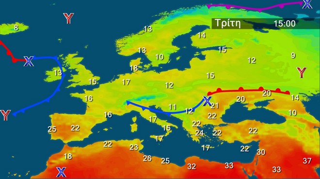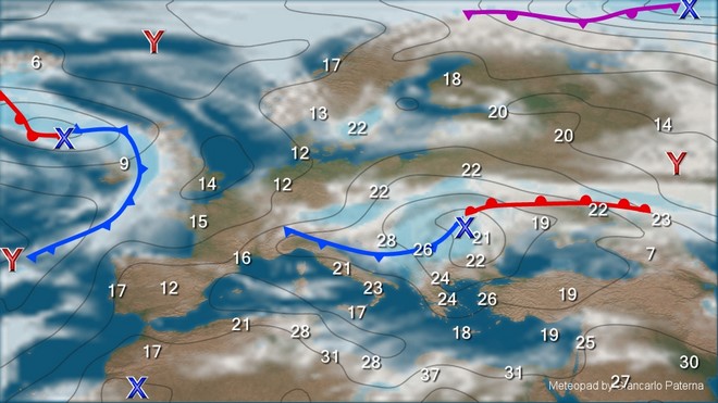 Στον γενικό χάρτη της Ευρώπης παρατηρούμε ότι διατηρείται ένα ομαλό πεδίο στη χώρα μας ενώ η κεντρική Ευρώπη επηρεάζεται από μετωπική δραστηριότητα. Υψηλές θερμοκρασίες επικρατούν στα ανατολικά τμήματα καθώς και στην Ιβηρική χερσόνησο.