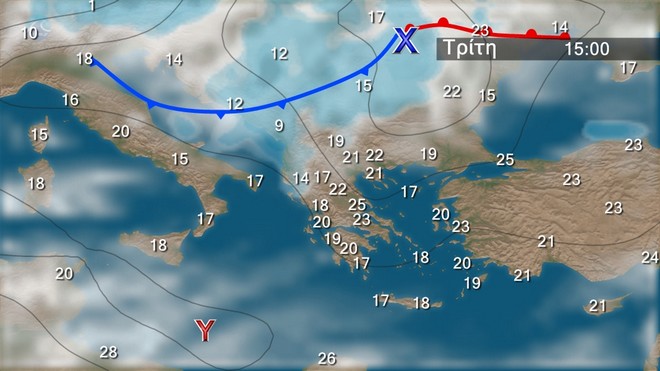 Στον χάρτη της Βαλκανικής που ακολουθεί παρατηρούμε ότι υπάρχει ένα εκτεταμένο βαρομετρικό χαμηλό που προκαλεί βροχές και καταιγίδες στα βορειότερα τμήματα. Στη χώρα μας θα επικρατήσουν λίγες νεφώσεις που πρόσκαιρα το μεσημέρι και το απόγευμα θα είναι αυξημένες στα δυτικά, τα κεντρικά και τα βόρεια και θα εκδηλωθούν τοπικές μπόρες ή καταιγίδες. Οι άνεμοι θα πνέουν από δυτικές διευθύνσεις 4 με 5 μποφόρ και στα νότια τοπικά 5 με 6 μπ. Η θερμοκρασία δεν θα σημειώσει αξιόλογη μεταβολή και θα φτάσει τους 25 βαθμούς στα βόρεια, στα υπόλοιπα ηπειρωτικά τους 25 με 26 και στα νησιά του Αιγαίου τους 25 με 26 βαθμούς Κελσίου.