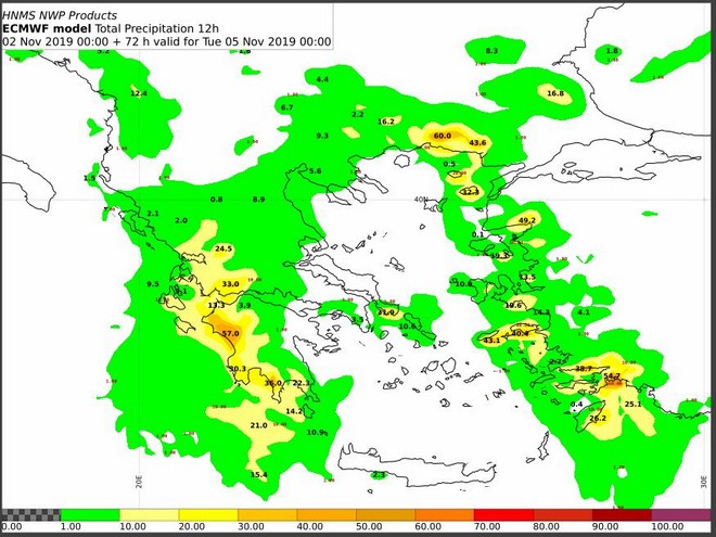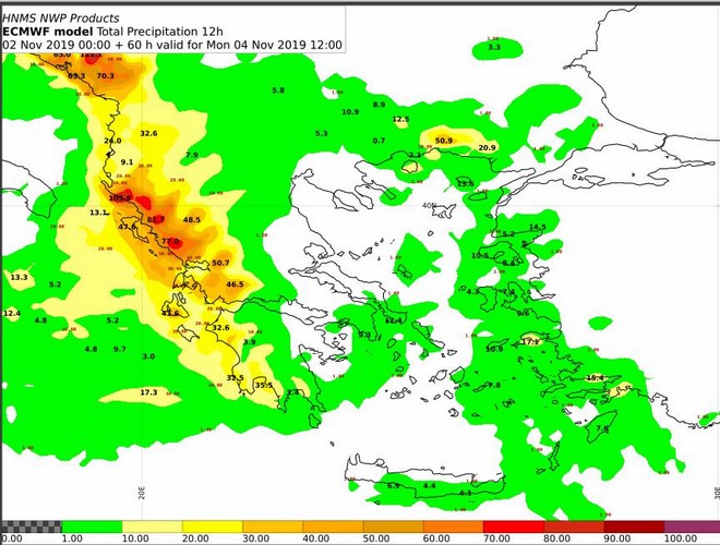 1. Από αργά το απόγευμα της Κυριακής (03-11-2019) μέχρι το βράδυ της Δευτέρας (04-11-2019), οπότε αναμένεται βαθμιαία εξασθένηση από τα βορειοδυτικά, τα νησιά του Ιονίου, η Ήπειρος, η Δυτική Στερεά και σταδιακά η Δυτική και η Νότια Πελοπόννησος.