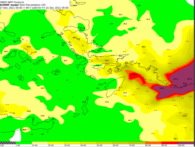 Θα πρέπει να επισημάνουμε ότι παρότι το έκτακτο δελτίο ισχύει μέχρι και την Τετάρτη, υπάρχουν ενδείξεις για μεγάλα ύψη υετού και την Πέμπτη στα Δωδεκάνησα, ειδικότερα στην περιοχή του Καστελόριζου, όπως απεικονίζεται στον χάρτη EFI που ακολουθεί. Στην πορεία των προγνώσεων θα επανεξεταστεί αυτή η περίπτωση και ενδέχεται να υπάρξει παράταση του δελτίου επιδείνωσης.