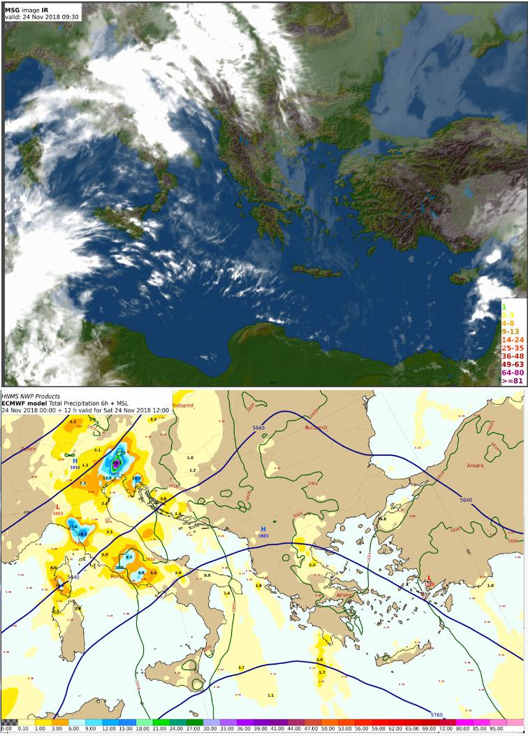 Στη δορυφορική εικόνα διακρίνεται ο σχεδόν αίθριος καιρός που επικρατεί σήμερα στη χώρα, καθώς και η αντικυκλωνική κυκλοφορία στον χάρτη που ακολουθεί ο οποίος είναι σύνθεση δύο χαρτών ( του χάρτη στα 500 hPa και του χάρτη επιφανείας με τον υετό).