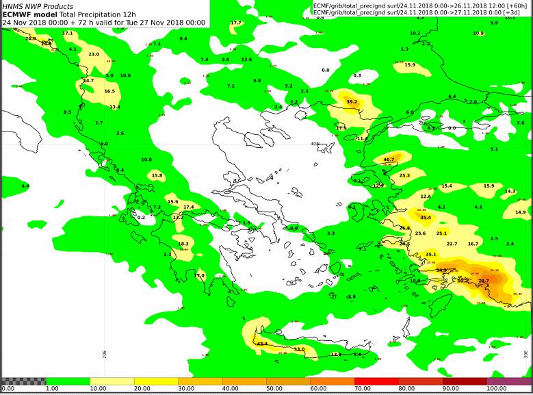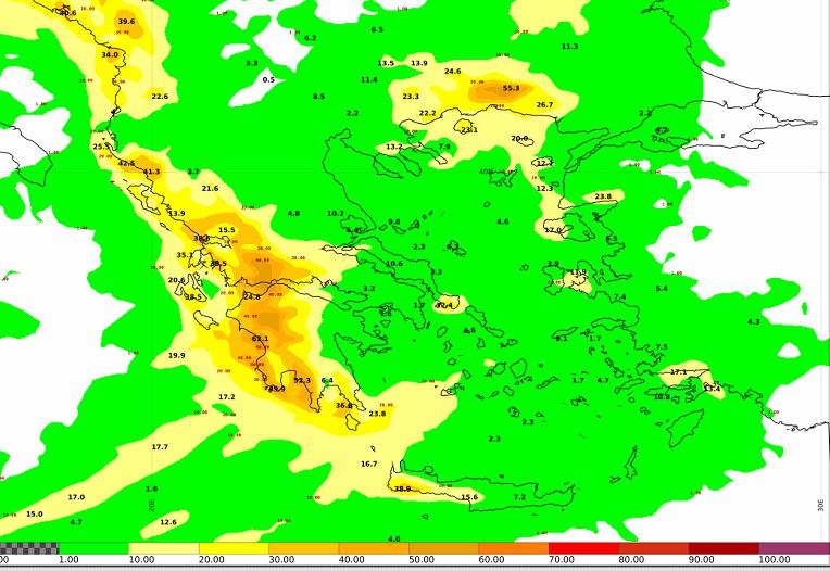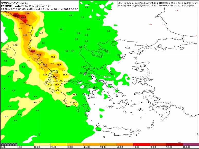 Την ίδια απεικόνιση υετού έχουμε και στους δύο παραπάνω χάρτες όπου στον πρώτο παρατηρούμε ότι μέχρι το μεσημέρι της Δευτέρας τα μεγαλύτερα ύψη υετού εμφανίζονται όχι μόνο στα δυτικά αλλά και στην Ανατολική Μακεδονία και Θράκη ,ενώ υπάρχουν κάποιες ενδείξεις για μεγάλα ύψη στην Δυτική Κρήτη το Ανατολικό Αιγαίο και τα Δωδεκάνησα , γι’ αυτό τον λόγο αναφέρουμε και αυτές τις περιοχές με πιθανότητα. Στον δεύτερο χάρτη βλέπουμε ότι από το μεσημέρι μέχρι το βράδυ της Δευτέρας τα ύψη υετού βαίνουν μειούμενα σε όλη τη χώρα.