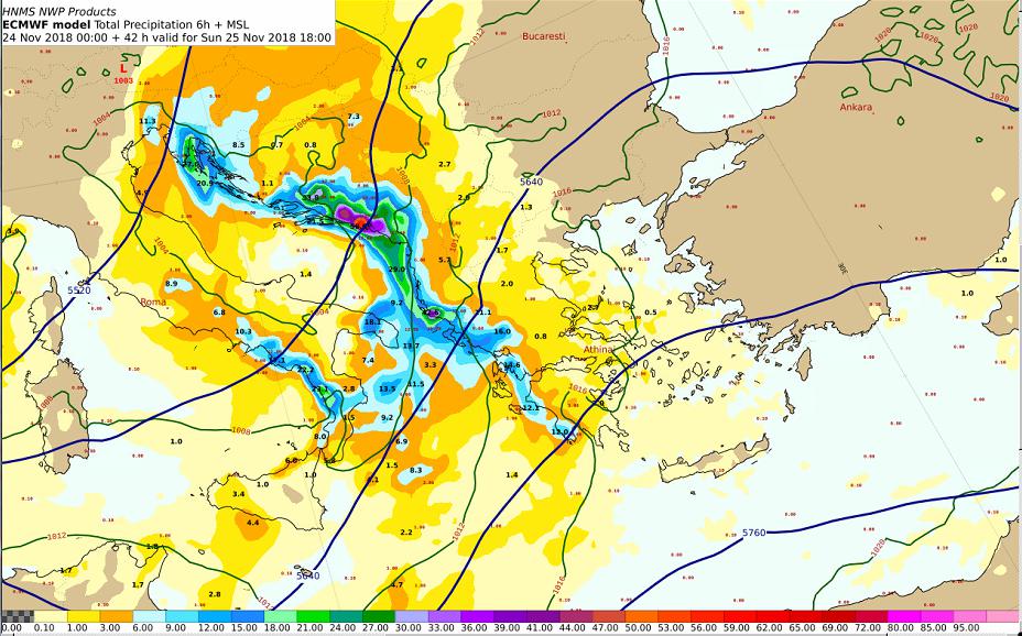 Για το χρονικό διάστημα που θα εκδηλωθούν τα έντονα φαινόμενα παραθέτουμε τον χάρτη επιφανείας με τα προβλεπόμενα ύψη υετού από το μεσημέρι μέχρι το απόγευμα της Κυριακής όπου ουσιαστικά μπορούμε να διακρίνουμε ότι θα επηρεαστούν κυρίως τα βορειοδυτικά τμήματα της χώρας.