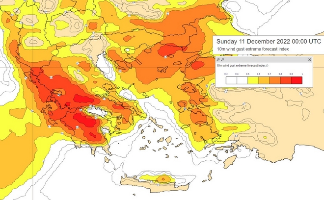 Πιο συγκεκριμένα, επιδείνωση θα παρουσιάσει ο καιρός το απόγευμα του Σαββάτου (10-12-2022) από τα βορειοδυτικά και βαθμιαία έως και το βράδυ της Κυριακής (11-12-2022) στην υπόλοιπη χώρα, με κύρια χαρακτηριστικά τις κατά τόπους ισχυρές βροχές και καταιγίδες που θα συνοδεύονται τοπικά από χαλαζοπτώσεις και τους θυελλώδεις νότιους ανέμους.