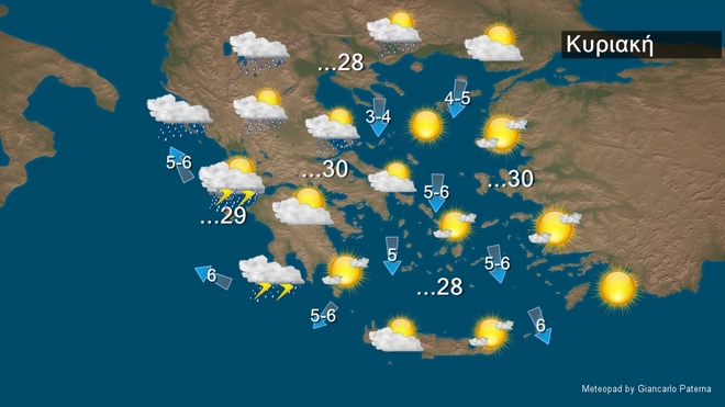 Στα δυτικά γενικά αίθριος καιρός με πρόσκαιρες νεφώσεις στα ηπειρωτικά τις μεσημβρινές και απογευματινές ώρες. Στις υπόλοιπες περιοχές λίγες νεφώσεις παροδικά αυξημένες με τοπικές βροχές και πιθανώς στην ανατολική νησιωτική χώρα όμβρους Οι άνεμοι θα πνέουν από βόρειες διευθύνσεις 3 με 5 και στο Αιγαίο τοπικά 6 μποφόρ. Η θερμοκρασία δεν θα αλλάξει σημαντικά
