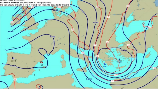 Έτσι τη Δευτέρα όπως μπορούμε να παρατηρήσουμε στον χάρτη που ακολουθεί το ανώτερο χαμηλό βρίσκεται πλέον πάνω από την χώρα μας με ψυχρές μάζες που στην στάθμη των 500 hPa φτάνουν τους -34 βαθμούς Κελσίου.