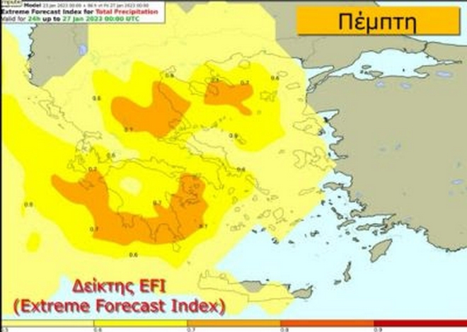 Οι βροχοπτώσεις θα επηρεάσουν κυρίως τα κεντρικά και νότια και ο δείκτης EFI δεν δείχνει ιδιαίτερα υψηλές τιμές. Τα ποσά υετού αν και θα είναι μεγάλα, δεν δείχνουν να φτάνουν σε ακραία επίπεδα για την εποχή.