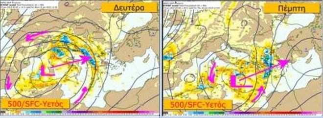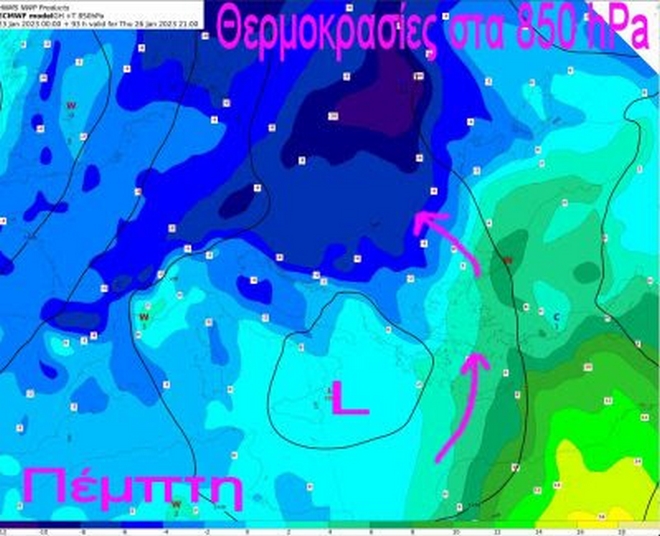 Οι θερμοκρασίες πέφτουν κυρίως στα κεντρικά και βόρεια. Χιονοπτώσεις θα σημειωθούν στα κεντρικά και βόρεια ορεινά καθώς και στα βόρεια ημιορεινά. Το χαμηλό στη στάθμη των 850 hPa που την Πέμπτη βρίσκεται στα Νοτιοδυτικά τμήματα της χώρας μας, προκαλεί νότιο ρεύμα στις κατώτερες στάθμες της ατμόσφαιρας στα ανατολικά , το οποίο “εμποδίζει” τις ψυχρές μάζες της Βαλκανικής να κατέβουν νοτιότερα.