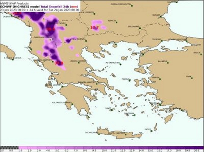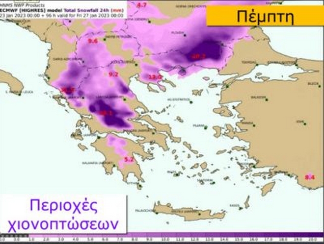 Οι χιονοπτώσεις θα είναι πολλές στη Κεντρική Ελλάδα καθώς και στη Θράκη (κυρίως στην οροσειρά της Ροδόπης), όπου εκεί θα χιονίσει και στα ημιορεινά.