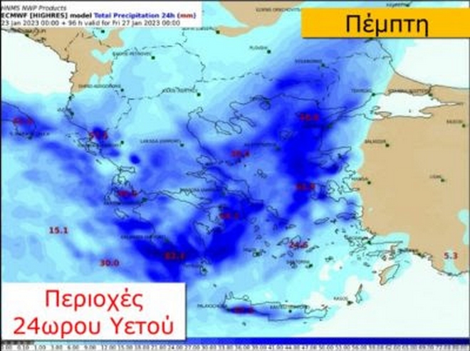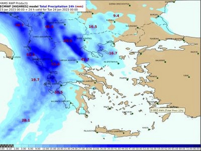 Επισημαίνεται ότι σήμερα Δευτέρα (23-01-2023) ισχυρές βροχές και καταιγίδες προβλέπονται στα νησιά του Ιονίου, την Ήπειρο, τη δυτική Στερεά και τη βορειοδυτική Πελοπόννησο έως το απόγευμα, με εξασθένηση το βράδυ, καθώς και στη δυτική και την κεντρική Μακεδονία. Από το βράδυ τα φαινόμενα θα επηρεαστούν τα βόρεια τμήματα της Θεσσαλίας, ενώ χιονοπτώσεις θα σημειωθούν στα ηπειρωτικά ορεινά, οι οποίες στη δυτική Μακεδονία και στην Ήπειρο (από 800 μέτρα και πάνω) θα είναι κατά τόπους πυκνές.