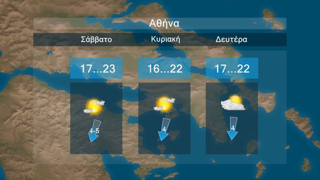 Στην Αττική προβλέπονται λίγες νεφώσεις που πρόσκαιρα στα ανατολικά και τα βόρεια θα αυξηθούν και ίσως βρέξει για λίγο. Οι άνεμοι θα πνέουν βορειοανατολικοί 4 με 6 και στα ανατολικά 6 με 7 μπόφορ.
