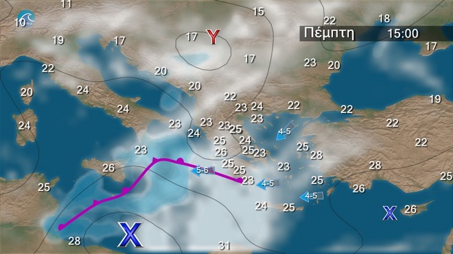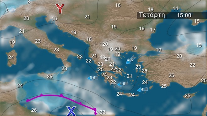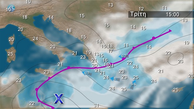 Νεφώσεις με τοπικές βροχές και καταιγίδες πιθανώς κατά τόπους ισχυρές στις Κυκλάδες,τα νησιά του ανατολικού Αιγαίου και τα Δωδεκάνησα που βαθμιαία από το μεσημέρι θα εξασθενήσουν και το βράδυ στα δυτικά και βόρεια θα σταματήσουν. Οι άνεμοι θα πνέουν στα νότια νότιοι νοτιοδυτικοί 3 με 5 στρεφόμενοι βαθμιαία σε ανατολικούς βορειοανατολικούς 5 με 6 μποφόρ. Στα υπόλοιπα από ανατολικές διευθύνσεις 4 με 6 και στο βόρειο Αιγαίο πρόσκαιρα το πρωί έως 7 μποφόρ. Η θερμοκρασία δεν θα σημειώσει αξιόλογη μεταβολή.