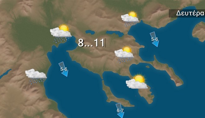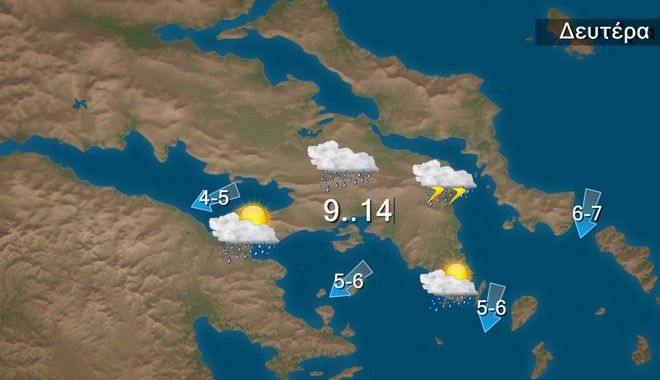Τη Δευτέρα στη δυτική Ελλάδα προβλέπονται νεφώσεις παροδικά αυξημένες με τοπικές βροχές κυρίως στα νότια. Στην υπόλοιπη χώρα νεφώσεις με βροχές και κυρίως στα θαλάσσια – παραθαλάσσια καταιγίδες. Τα φαινόμενα στην ανατολική χώρα και κυρίως την κεντρική και ανατολική Μακεδονία, τη Θράκη, την ανατολική Θεσσαλία, τις Σποράδες, την ανατολική Στερεά, την Εύβοια, τα νησιά του ανατολικού Αιγαίου, τις Κυκλάδες, την Κρήτη τα Δωδεκάνησα και τις πρωινές ώρες την ανατολική Πελοπόννησο θα είναι έντονα. Από το απόγευμα και από τα βόρεια τα φαινόμενα βαθμιαία θα εξασθενήσουν.