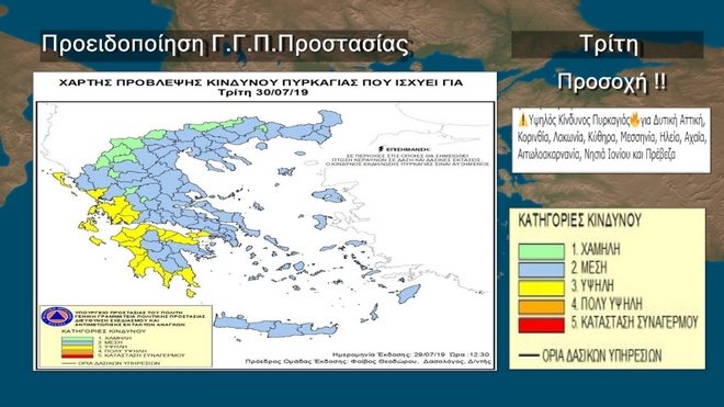 Από πλευράς επικινδυνότητας πυρκαγιών την Τρίτη θα έχουμε Υψηλό Κίνδυνο Πυρκαγιάς για Δυτική Αττική, Κορινθία, Λακωνία, Κύθηρα, Μεσσηνία, Ηλεία, Αχαΐα, Αιτωλοακαρνανία, νησιά Ιονίου και Πρέβεζα σύμφωνα με την πρόβλεψη της Γενικής Γραμματείας Πολιτικής Προστασίας.