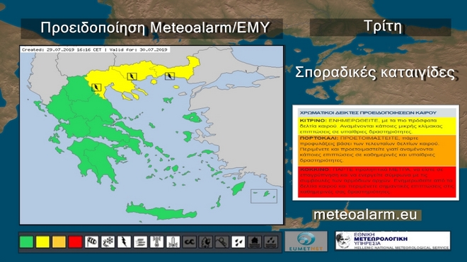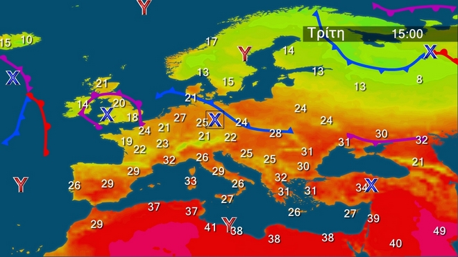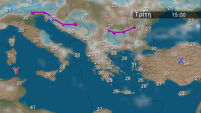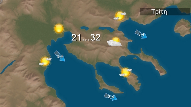 Την Τρίτη στη Μακεδονία και τη Θράκη προβλέπονται λίγες νεφώσεις παροδικά αυξημένες με τοπικούς όμβρους και μεμονωμένες καταιγίδες κυρίως στα ορεινά τις μεσημβρινές και απογευματινές ώρες. Στην υπόλοιπη χώρα γενικά αίθριος καιρός με πρόσκαιρες νεφώσεις τις μεσημβρινές και απογευματινές ώρες στα ηπειρωτικά όπου θα εκδηλωθούν τοπικοί όμβροι στα ορεινά. Οι άνεμοι θα πνέουν από βόρειες διευθύνσεις 3 με 5 μποφόρ. Η θερμοκρασία θα σημειώσει μικρή πτώση και θα φτάσει στα βόρεια τους 33 βαθμούς, στα δυτικά τους 34, στα υπόλοιπα ηπειρωτικά τους 36 βαθμούς και στα νησιά του Αιγαίου τους 30 με 34 βαθμούς Κελσίου.