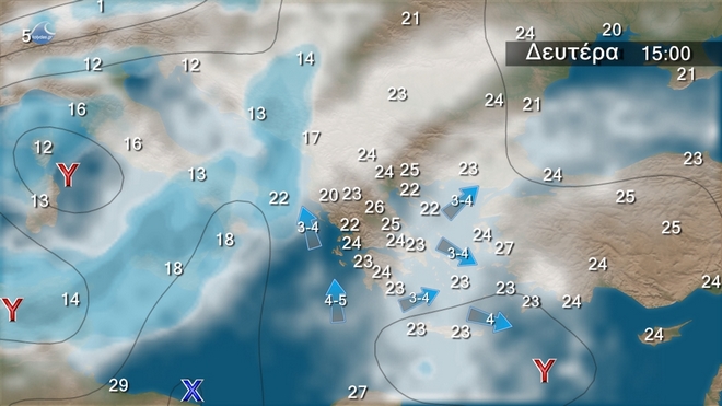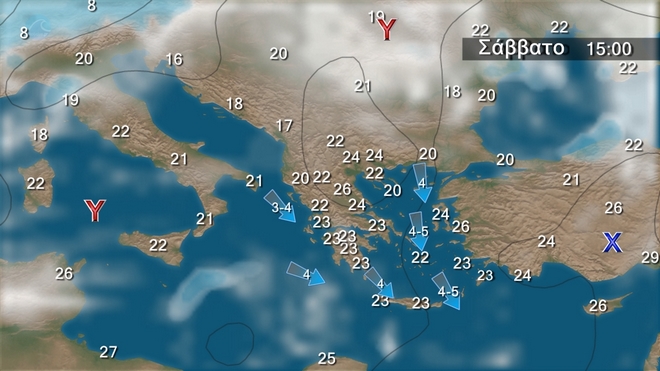 Οι άνεμοι θα πνέουν αρχικά νότιοι νοτιοδυτικοί 4 με 6 που βαθμιαία από τα δυτικά θα στραφούν σε δυτικούς βορειοδυτικούς με την ίδια ένταση και από το απόγευμα στο Ιόνιο και τη νύχτα στο βορειοδυτικό Αιγαίο θα ενισχυθούν τοπικά σε 7 μποφόρ.