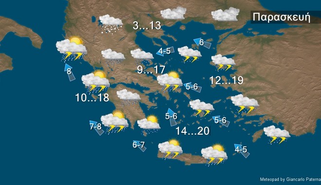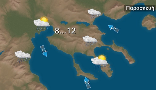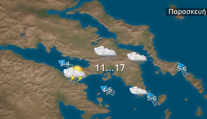 Την Παρασκευή θα εκδηλωθούν ισχυρές βροχές και κυρίως στα θαλάσσια-παραθαλάσσια καταιγίδες, που θα συνοδεύονται κατά τόπους από χαλαζοπτώσεις, οι οποίες θα επηρεάσουν το μεγαλύτερο μέρος της χώρας. Τα φαινόμενα από το απόγευμα και από τα δυτικά βαθμιαία θα εξασθενήσουν.