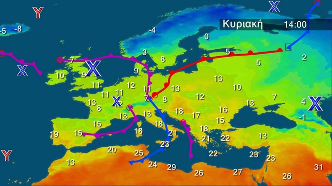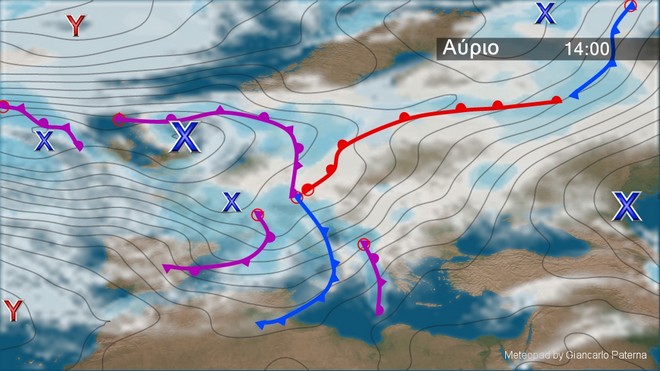 Στον γενικό χάρτη της Ευρώπης διακρίνονται τα βαρομετρικά χαμηλά και τα μέτωπα που επηρεάζουν κυρίως τα δυτικά και βόρεια της Ευρώπης. Το βασικό χαμηλό αν και περνά βορειότερα με το νοτιοδυτικό ρεύμα στην περιοχής μας θα προκαλέσει τα εντονότερα φαινόμενα κυρίως στα δυτικά και αργότερα το ανατολικό Αιγαίο.