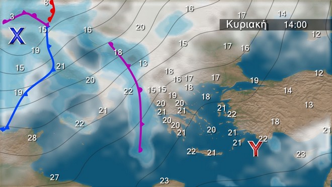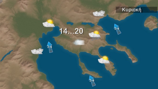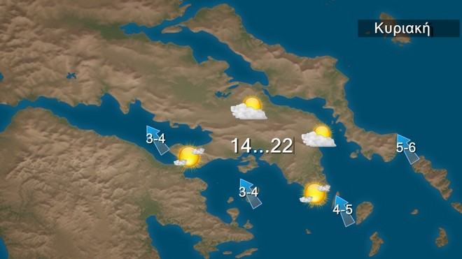 Τη Κυριακή στα δυτικά προβλέπονται νεφώσεις με βροχές και σποραδικές καταιγίδες αρχικά στο Ιόνιο και την Ήπειρο και σταδιακά και στα υπόλοιπα. Τα φαινόμενα από αργά το απόγευμα θα ενταθούν και θα είναι κατά τόπους ισχυρά. Στις υπόλοιπες περιοχές αραιές νεφώσεις που από το μεσημέρι στα υπόλοιπα ηπειρωτικά και την Κρήτη θα πυκνώσουν και τις βραδινές ώρες θα εκδηλωθούν τοπικές βροχές. Τοπικά περιορισμένη ορατότητα ή ομίχλες στα ανατολικά τις πρωινές ώρες. Οι άνεμοι στα δυτικά νότιοι νοτιοανατολικοί 4 με 6 και στο Ιόνιο τοπικά έως 7 μποφόρ. Στα ανατολικά μεταβλητοί 3 με 4 που γρήγορα θα στραφούν σε νότιους νοτιοανατολικούς και από το απόγευμα θα ενισχυθούν τοπικά στο Αιγαίο σε 6 μποφόρ. Η θερμοκρασία  θα φτάσει τους 20 βαθμούς στα βόρεια, στα υπόλοιπα ηπειρωτικά και το Ιόνιο τους 21 με 22 και στα νησιά του Αιγαίου τους 22 με 23 βαθμούς Κελσίου.