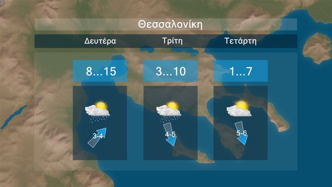 Την Τρίτη βροχές και σποραδικές καταιγίδες θα εκδηλωθούν κυρίως στα κεντρικά τα βόρεια και τα νησιά του Ανατολικού Αιγαίου , ενώ θα χιονίσει στα κεντρικά και βόρεια ορεινά. Τα φαινόμενα πιθανόν να είναι κατά τόπους ισχυρά. Οι άνεμοι θα φτάνουν τοπικά τα 7 μπ στα πελάγη και η θερμοκρασία θα παρουσιάσει πτώση στα βόρεια Την Τετάρτη θα έχουμε κακοκαιρία σε όλη τη χώρα με βροχές καταιγίδες στα θαλασσιά τμήματα και χιόνια στα ορεινά και ημιορεινά . Οι άνεμοι τυπικά θα φτάνουν τα 8 με 9 μποφόρ και η θερμοκρασία θα πέσει κατά 7 με 8 βαθμούς Κελσίου.