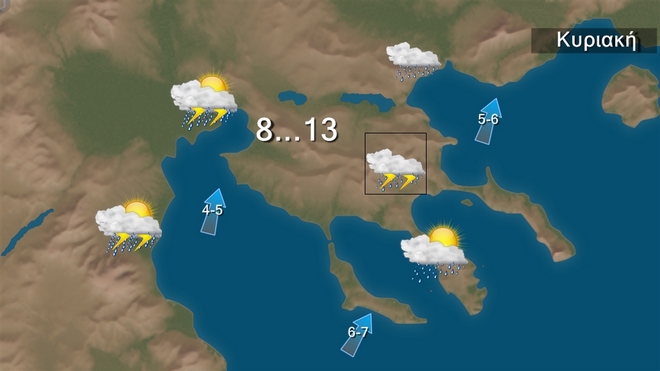 Την Κυριακή σε όλη τη χώρα προβλέπεται συννεφιά με βροχές και κυρίως στα θαλάσσια – παραθαλάσσια σποραδικές καταιγίδες. Τα φαινόμενα που θα είναι κατά τόπους ισχυρά κυρίως στα δυτικά, την ανατολική Μακεδονία, τη Θράκη και το ανατολικό Αιγαίο, από το βράδυ στα δυτικά θα εξασθενήσουν. Χιόνια θα πέσουν στα ηπειρωτικά ορεινά καθώς και σε ημιορεινές περιοχές της βορειοδυτικής χώρας. Οι άνεμοι θα πνέουν νότιοι νοτιοανατολικοί 6 με 7 και στα πελάγη τοπικά 8 μποφόρ. Από το μεσημέρι στο Ιόνιο θα στραφούν σε δυτικούς νοτιοδυτικούς και θα εξασθενήσουν. Η θερμοκρασία θα σημειώσει μικρή πτώση και θα έχει μέγιστη τιμή στα βόρεια τους 15 βαθμούς, στα υπόλοιπα ηπειρωτικά και το Ιόνιο τους 18 βαθμούς Κελσίου, στις Κυκλάδες και την Κρήτη τους 19 βαθμούς και στο Ανατολικό Αιγαίο και τα Δωδεκάνησα τους 19 βαθμούς Κελσίου.