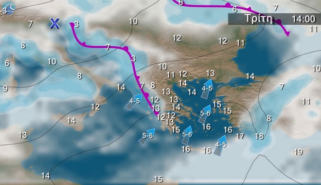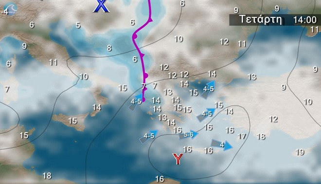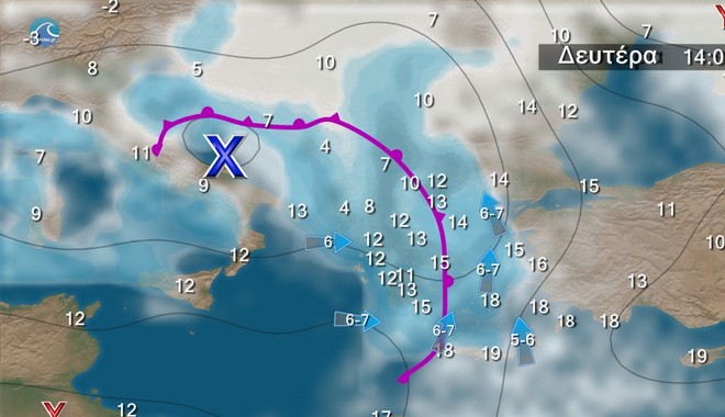 Στις Κυκλάδες, την Κρήτη και τα Δωδεκάνησα προβλέπονται παροδικά αυξημένες νεφώσεις με τοπικές βροχές κυρίως από τις απογευματινές ώρες οπότε θα εκδηλωθούν και σποραδικές καταιγίδες. Στην υπόλοιπη χώρα προβλέπονται νεφώσεις με βροχές και καταιγίδες αρχικά στα δυτικά και τα βόρεια και βαθμιαία και στις υπόλοιπες περιοχές. Τα φαινόμενα που πιθανώς να είναι κατά τόπους ισχυρά, από το μεσημέρι και από τα δυτικά προβλέπεται να εξασθενήσουν. Χιονοπτώσεις θα σημειωθούν στα ηπειρωτικά ορεινά κυρίως της δυτικής και βόρειας χώρας. Οι άνεμοι θα πνέουν στα δυτικά νοτιοδυτικοί 3 με 5 μποφόρ και νωρίς το πρωί στο Ιόνιο έως 6 μποφόρ. Στα ανατολικά νότιοι νοτιοανατολικοί 5 με 6 και στο Αιγαίο 7 και πιθανώς τοπικά 8 μποφόρ, που από το απόγευμα θα στραφούν σε δυτικούς νοτιοδυτικούς και θα εξασθενήσουν. Η θερμοκρασία θα σημειώσει μικρή πτώση κυρίως στα δυτικά και τα βόρεια.